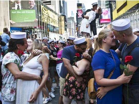 Os protagonistas do registro de Eisenstaedt foram identificados com a curiosidade e com o tempo discorrido: ele, George Mendonça, um marinheiro recém-chegado da Europa; ela, Greta Friedman, uma assistente de dentista que passava pela rua para celebrar a paz. Paz. Essa foto através de um beijo heterossexual no meio da rua se tornou símbolo de paz. Greta e George chegaram a se reencontrar, já idosos, no mesmo local onde foram centro das atenções das lentes de Eisenstaedt.