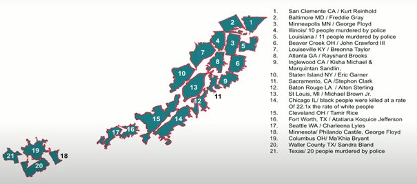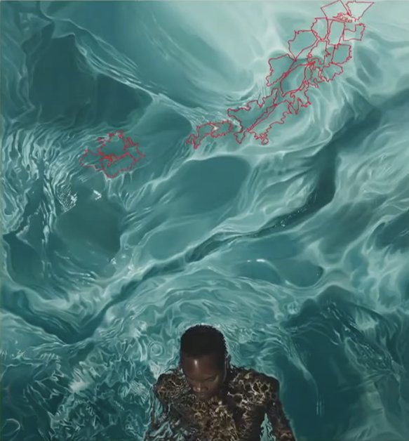 Dessa maneira, a artista inseriu mapas de todos os lugares em que as mortes policiais estavam acontecendo naquele período dentro de sua pintura, de forma mascarada na parte superior do quadro. Ela camufla os mapas dentro da água, de forma a não entregar que eles estão lá para o espectador. Mas eles estão. A pintura, à primeira vista, pode aparentar ser apenas um belíssimo trabalho de hiper-realismo da figura humana e do elemento água, mas suas camadas vão muito além disso. (RAWLES, 2022)