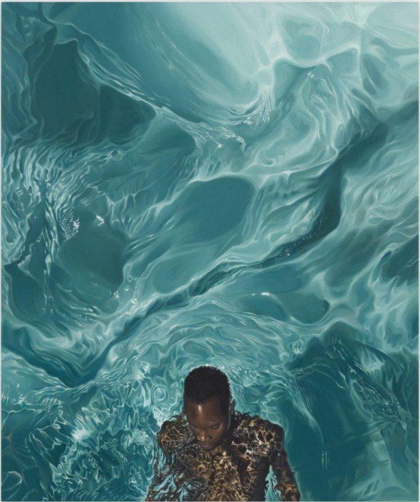 Calida Garcia Rawles (1976) é uma artista que estudou artes em Nova York e atualmente vive em Los Angeles. A principal característica de suas pinturas é a onipresença da água e a – quase – onipresença de figuras humanas: ou emergidas na água, ou boiando, ou nadando… A artista contou, em uma palestra no Anderson Ranch Arts Center [1] (2022), que a água só foi se tornar um elemento importante quando começou a fazer aulas de natação depois de seus 30 anos. Foi neste momento que oelemento a encantou, tanto no sentido físico (de como ela se sentia bem dentro da água) quanto no sentido espiritual e no estético (de como a incidência da luz dentro da água a chamava atenção).
